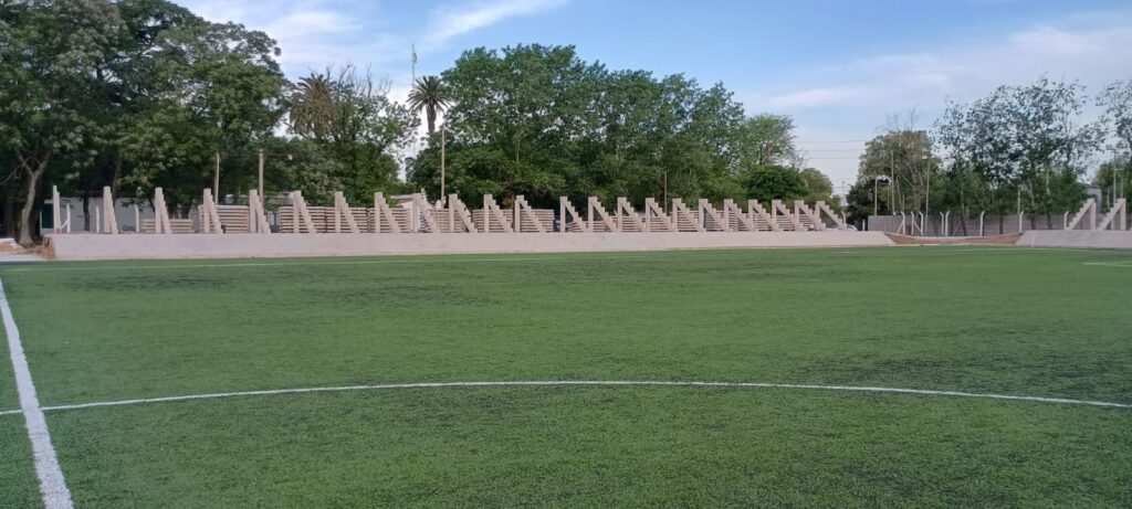 Tras la colocación de la alfombra y la demarcación del campo de juego, se colocaron los arcos y se comenzó con la construcción de los terraplenes que contendrán a las gradas o tribunas. Una vez finalizada la compactación de los terraplenes se les construyó una platea de hormigón, se construyeron las veredas de hormigón alrededor del campo de juego, finalizando con los tabiques (también en hormigón), para darle una terminación profesional.