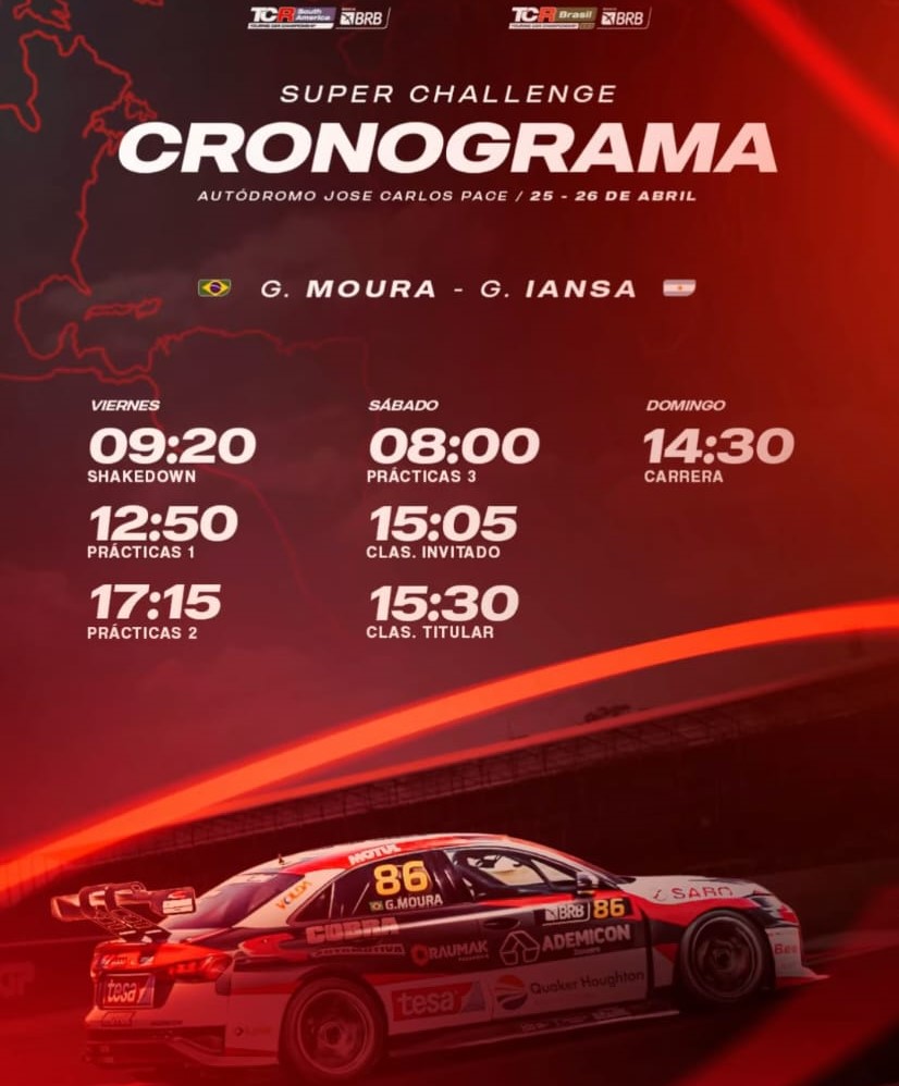 El Súper Challenge de Interlagos contará con un formato especial: una carrera de 58 minutos más una vuelta, con cambio obligatorio de pilotos entre las vueltas 17 y 22. Esta dinámica estratégica añade un condimento extra a la competencia, donde cada equipo deberá ejecutar con precisión el ingreso a boxes y el recambio, respetando un tiempo mínimo de 1 minuto y 45 segundos para evitar penalizaciones.